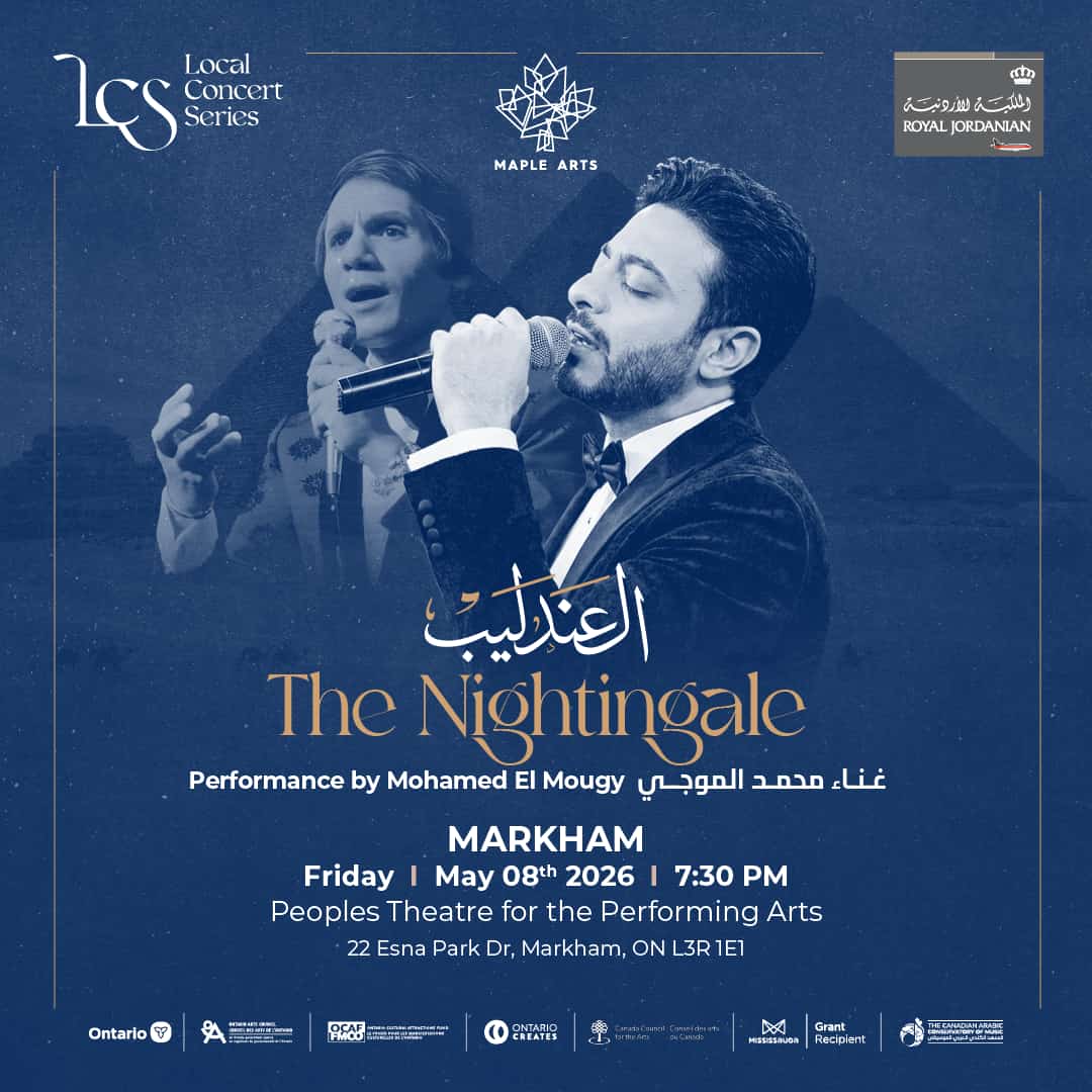 Presented by Maple Arts and brought to life by the Canadian Arabic Orchestra, the concert features Abdel Halim’s most beloved songs performed with the richness and grandeur of a full live orchestra.