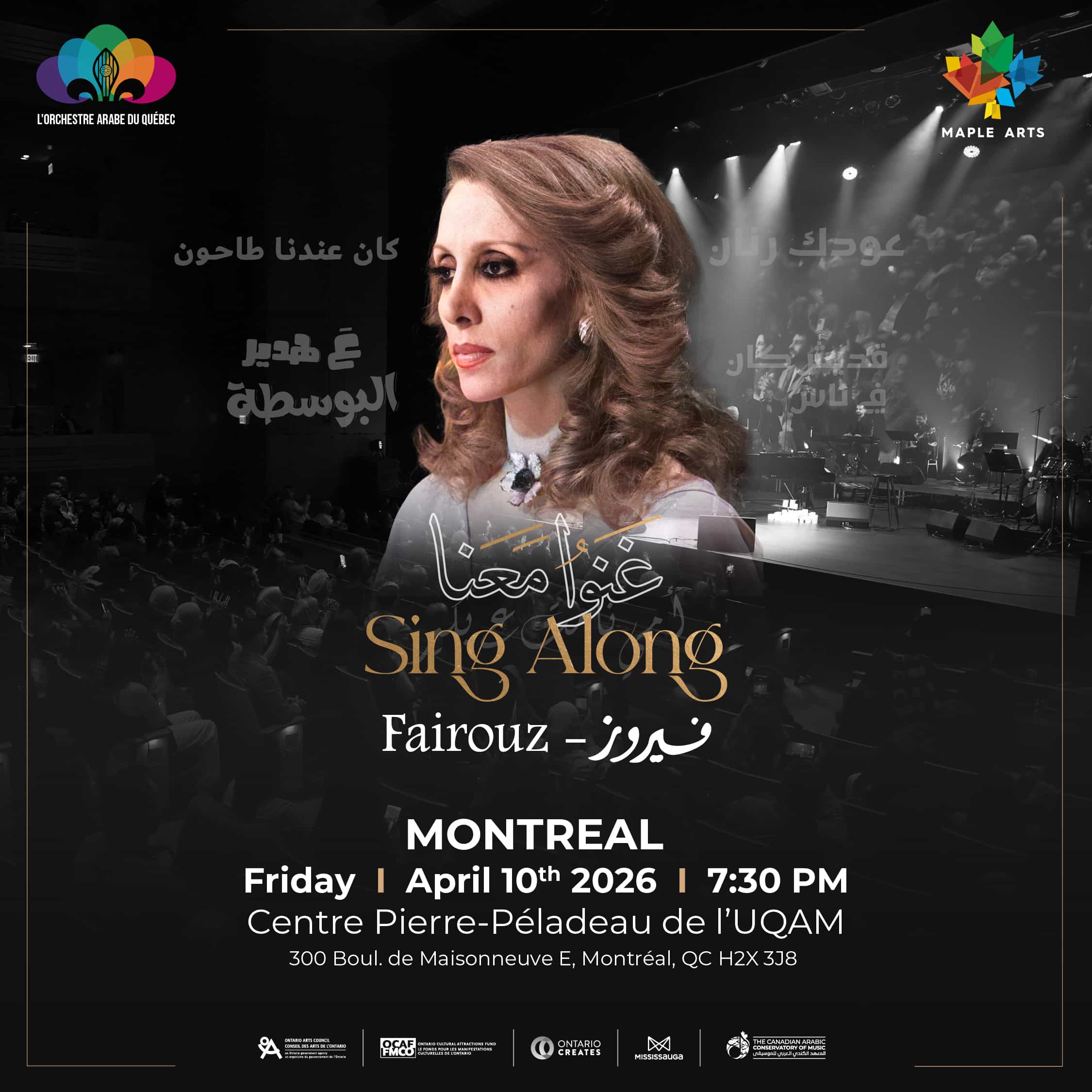 The evening will be presented by Maple Arts Group, featuring musicians from the Canadian Arabic Orchestra, inviting the audience to relive and sing along to the unforgettable melodies that made Fairouz an eternal legend.